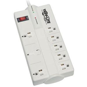 Surge protector is designed to protect electronic equipment against surges, spikes and line noise. Design accommodates bulky transformers without blocking remaining outlets. LEDs warn of potential power problems. Lighted power switch with integrated 15 amp circuit breaker offers power control and overload protection. Surge protector also features 8 outlets, an 8' cord with space-saving angle plug, and integrated child-safety sliding outlet covers. 1440 joules AC surge suppression shields equipment from the strongest surges and line noise.