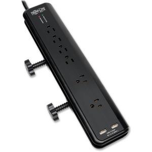 Six-outlet surge protector offers economical AC surge suppression for protection of workstations, desktop computers, telecom systems and more. Built-in, AC surge suppression shields your connected equipment from damage and performance problems due to transient surges. Two USB charging ports offer fast charging for smartphones, tablets, MP3 players and other portable devices. Diagnostic LED warns of suppressor damage to prevent unexpected damages. 2100-joule AC suppression rating shields equipment from surges and line noise. Two clamps feature two knobs to easily attach it to the side of your desk, workbench or table.